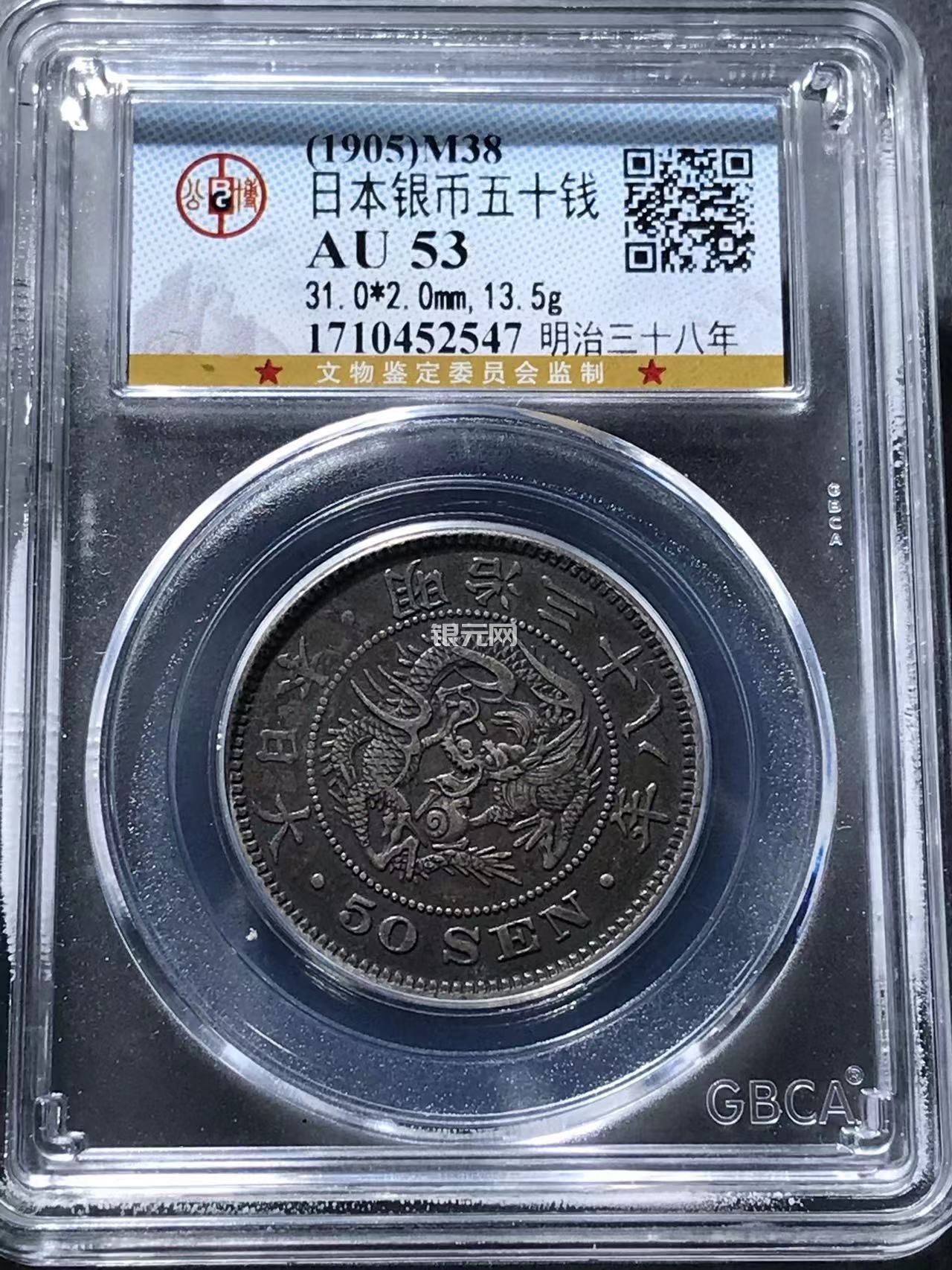 公博评级AU53黑包浆日本半圆龙五十钱-165米